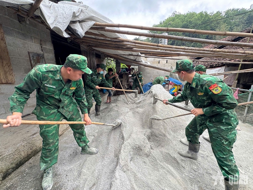 Cán bộ, chiến sĩ Đồn Biên phòng cửa khẩu Lý Vạn giúp đồng bào dân tộc thiểu số xóa nhà tạm, nhà dột nát. Ảnh: TRẦN HÙNG