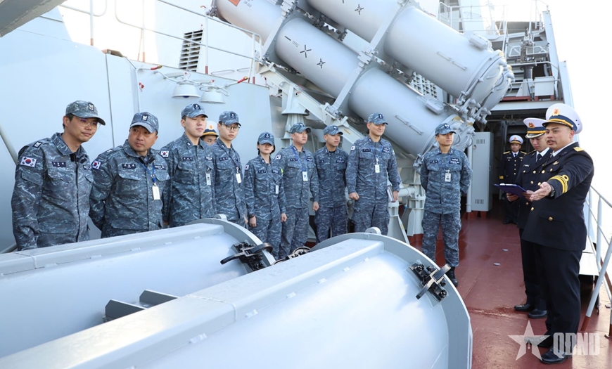 | Sĩ quan, thủy thủ Hải quân Hàn Quốc tham quan Tàu 015-Trần Hưng Đạo (Lữ đoàn 162, Vùng 4 Hải quân) trong chuyến thăm xã giao Hàn Quốc của Tàu 015. |