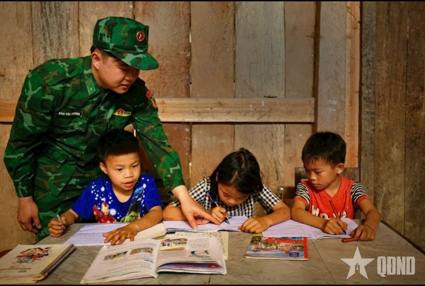 Bộ đội Đồn Biên phòng Cốc Pàng dạy các em học sinh ở bản. Ảnh: HOÀNG ĐẠT