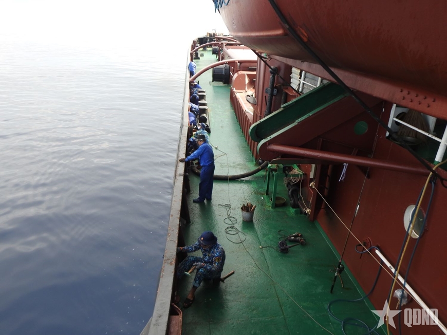 Cán bộ, nhân viên Tàu 960, Vùng 2 Hải quân bảo quản, bảo dưỡng trên biển. Ảnh: PHẠM DƯƠNG