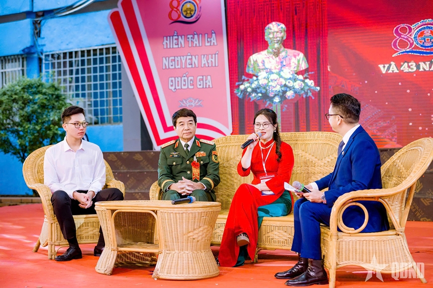 Thượng tướng Võ Văn Tuấn và TS Nguyễn Thị Phương Lan giao lưu, chia sẻ với giáo viên và học sinh Trường THPT Nguyễn Trãi-Ba Đình. Ảnh: XUÂN THỨ