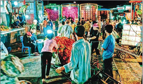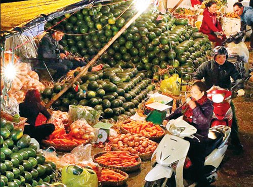 Càng về đêm, chợ Long Biên càng nhộn nhịp. Theo Ban quản lý chợ, lượng nông sản vận chuyển đến chợ mỗi ngày khoảng 200 đến 300 tấn. Khoảng từ 12 giờ đêm tới 1 giờ sáng là thời gian nhộn nhịp nhất. Khắp chợ bày hàng trăm thùng hoa quả được xếp chồng chất, hàng nghìn sọt rau, bao tải các loại củ ngổn ngang. Từ chợ đầu mối này, số hoa quả, rau củ đó lại được đưa đi theo những người buôn lẻ đến các khu chợ khác trên địa bàn Hà Nội để phục vụ người dân thành phố.