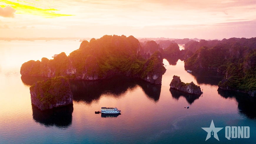 Từ lan can phà, những dãy núi đá vôi sừng sững như những pháo đài tự nhiên hiện dần ra. Các đảo nằm chen chúc, đảo này nối đảo kia bằng màn sương mỏng và sóng nước. Mỗi hòn đảo dường như có linh hồn riêng, có tên gọi riêng: Hòn Gà Chọi, hòn Lư Hương, hòn Chó Đá... đã đứng đó qua bao biến thiên trời đất, như những nhân chứng của thời gian. Trên mặt nước, những chiếc thuyền nan nhỏ của ngư dân lững lờ trôi. Xa xa, trên những lồng bè nuôi hải sản, làn khói lam chiều mỏng manh như sợi tơ vương trên mái bè. Trên phà, tiếng cười nói vang lên giữa bao la sóng nước khiến cảnh sắc và con người như hòa làm một.