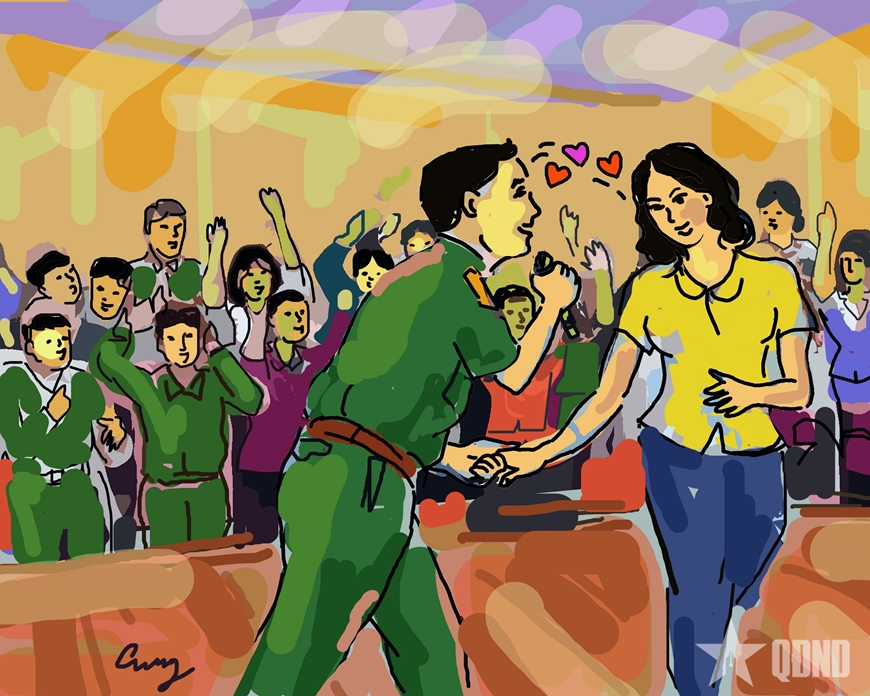 Cả hội trường hò reo rần rần. Trung úy Thi đứng hình ba giây. Rồi không hiểu lấy đâu ra dũng khí, anh bước lên, giơ tay xin micro lại: