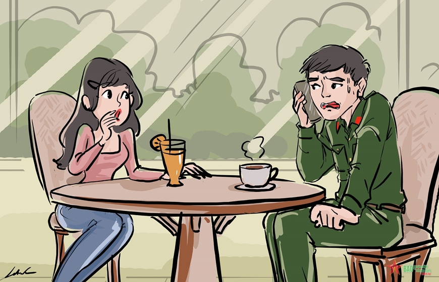 - Khi nãy, ra quán cà phê, tớ với bạn gái chọn ngồi góc trong của quán. Vừa ngồi được một lát thì anh Hùng gọi vào di động hỏi: “Hôm nay Hiểu trực ban à?”. Tớ liền trả lời: “Vâng ạ!”. Anh lại hỏi tiếp: “Thế cậu có đang ở phòng trực không?”. Tớ giật mình, sau đó cố bình tĩnh, nói: “Dạ, em đang ở phòng trực ạ!”. Anh Hùng im lặng một lát rồi nói: “Cậu mở cuốn danh bạ điện thoại, tìm đọc cho anh số trực ban của đơn vị X với”.