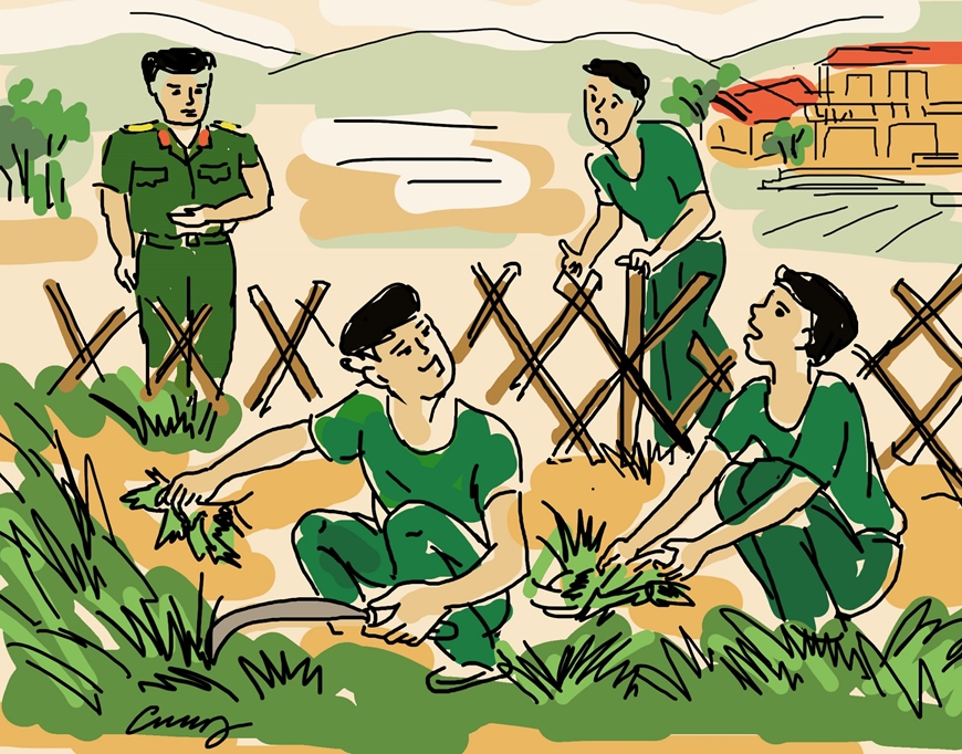 Buổi sáng ngày nghỉ, đại đội được lệnh tổng vệ sinh doanh trại. Hậu cùng tổ ra bãi sau đơn vị nhặt rác, phát quang bụi rậm. Trời nắng chang chang, mồ hôi chảy ướt lưng áo, ai nấy đều mệt phờ.