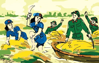 Cùng gặt lúa với đơn vị còn có lực lượng dân quân địa phương. Từ thôn đội trưởng đến các dân quân đều là nữ. Các cô kéo theo mấy chiếc thuyền gỗ nhỏ để chở lúa. Thấy có bộ đội giúp gặt lúa với mình, các nàng mắt ai cũng lóng la lóng lánh, miệng thì cười tủm tỉm duyên dáng lắm! Cũng lạ cho con gái miền Trung, sống giữa vùng nắng cháy mưa chan này mà da dẻ ai cũng trắng ngần, lưng ong thắt đáy, xinh tươi đáo để!