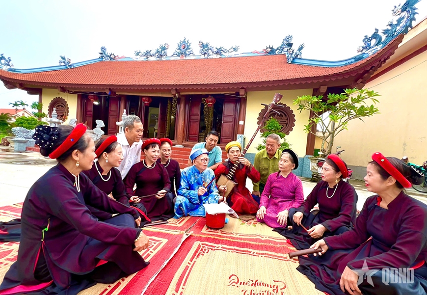 Nghệ nhân Ưu tú Trương Quang Hiến (áo dài xanh) huấn luyện biểu diễn ca trù tại Câu lạc bộ Ca trù Dân Chủ. |