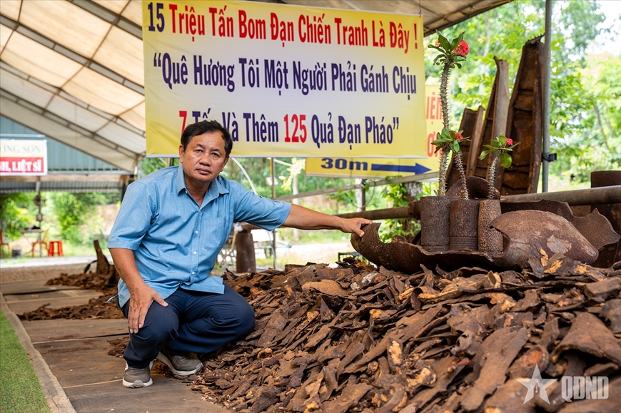 Ông Trần Công Chức bên các vỏ bom đạn bị vỡ nát. Ảnh do nhân vật cung cấp