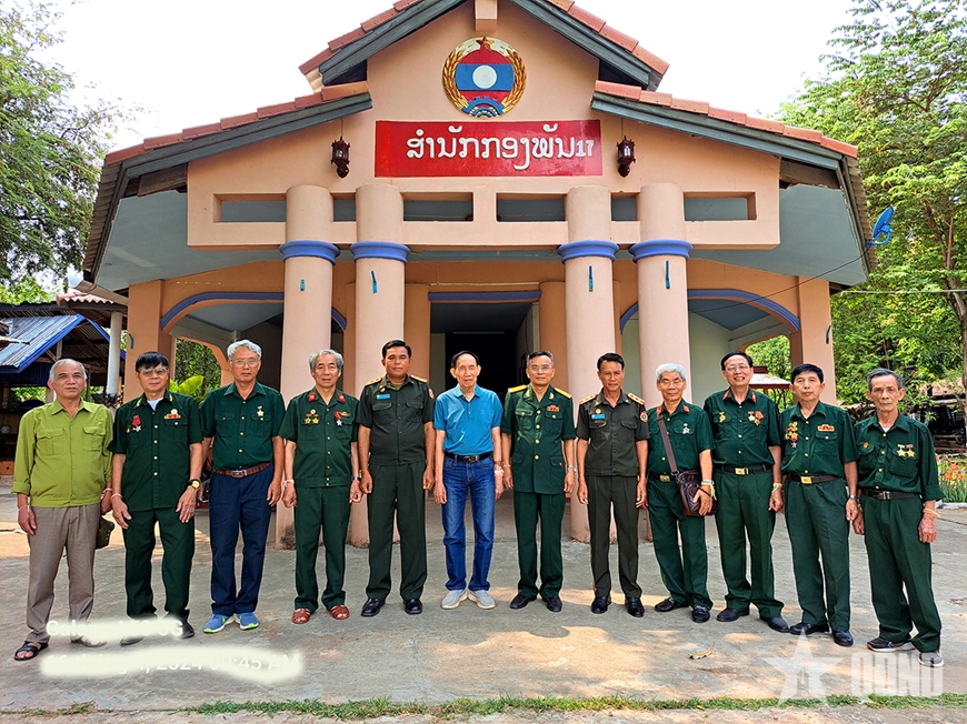 | Đại tá Trương Quang Thành (thứ sáu, từ phải sang) về thăm lại Khongxedone, tỉnh Saravane (Lào), tháng 4-2024. Ảnh: LÊ LỢI |