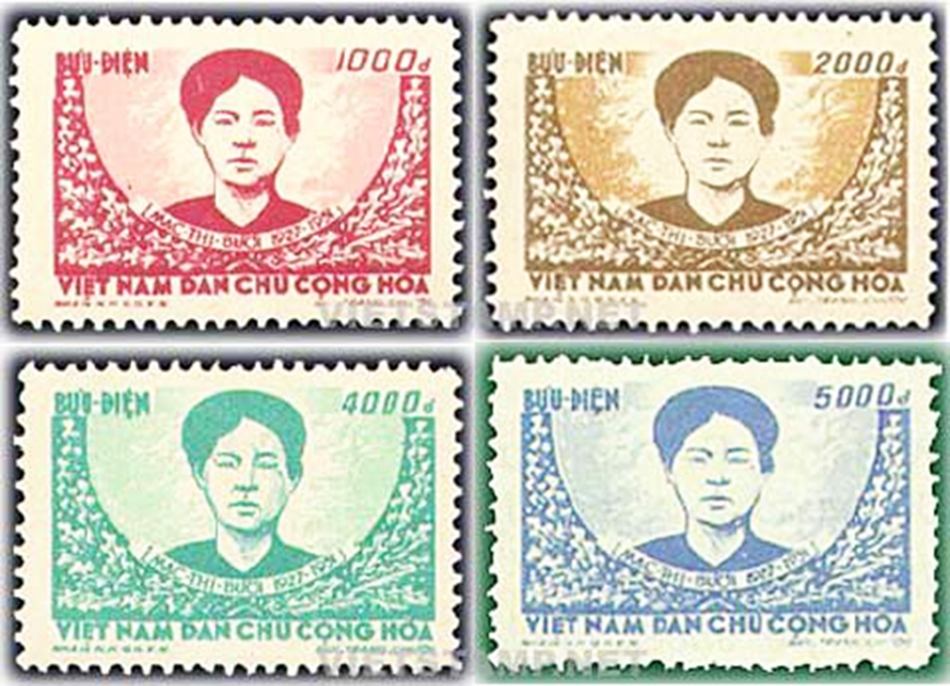 Bộ tem Anh hùng Mạc Thị Bưởi do bưu chính Việt Nam phát hành năm 1956. Ảnh tư liệu