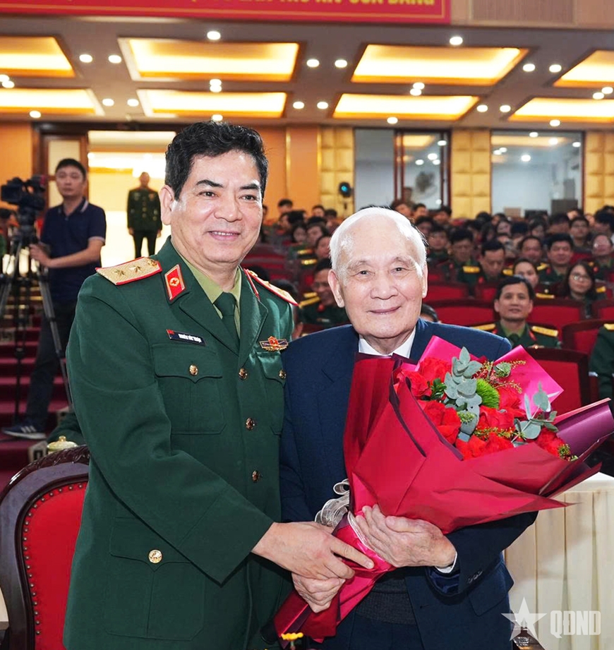 | Lãnh đạo Học viện Quân y chúc mừng Giáo sư, Tiến sĩ, Thầy thuốc Ưu tú Nguyễn Tụ (bên phải) nhân Ngày Nhà giáo Việt Nam (20-11-2025). Ảnh: TUẤN DŨNG |