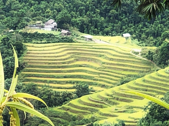 Con đường trải nhựa phẳng lỳ uốn lượn lên tận trời xanh, mây trắng bồng bềnh, những thửa ruộng bậc thang bên sườn núi, dưới thung lũng tạo nên bức tranh vàng xanh sống động.