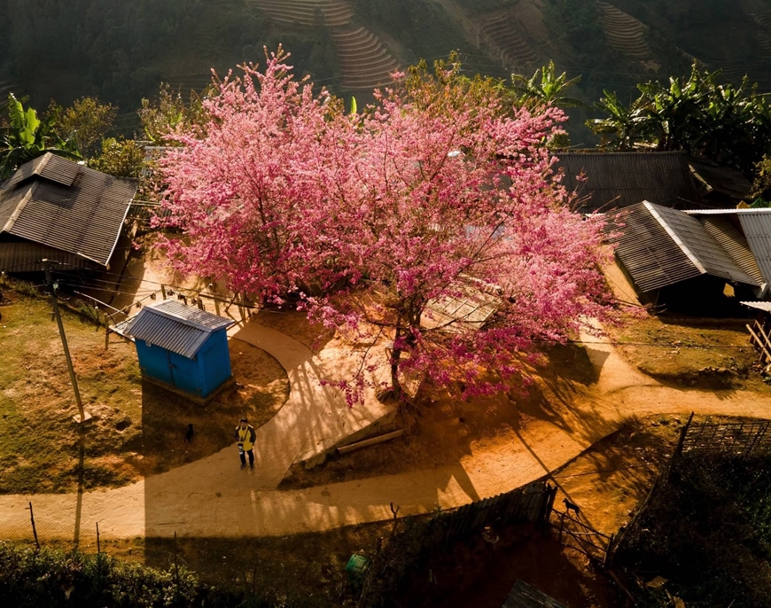 Hoa tớ dày thường nở từ giữa tháng 12. Dọc theo những con đường quanh co dẫn vào các bản làng người Mông, những bông tớ dày bung nở, tạo thành những vòm hoa mềm mại phớt hồng giữa nền trời xanh và núi đá xám. Cả không gian như được phủ một lớp voan mỏng, khiến Mù Cang Chải trở nên dịu dàng, trầm lắng hơn thường ngày.