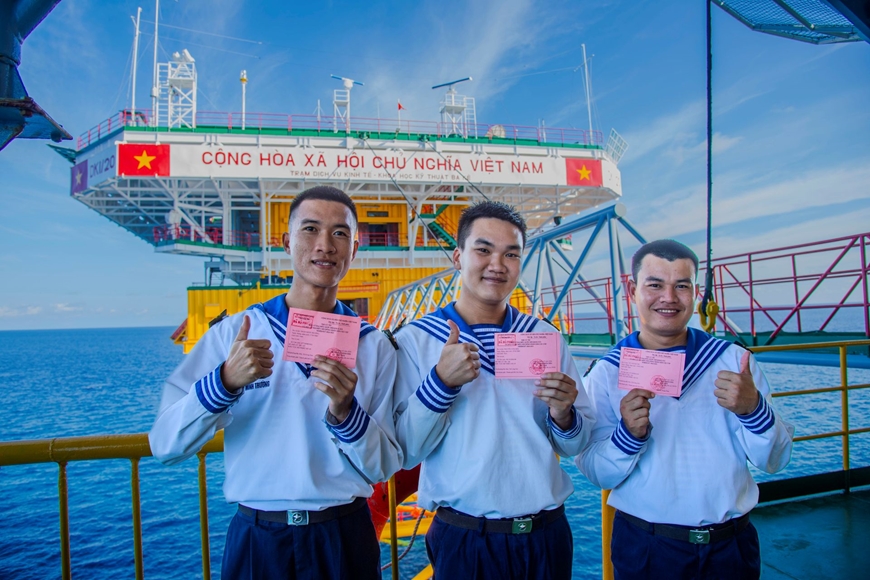 Các chiến sĩ Nhà giàn DK1/20 tự hào khi lần đầu tiên được bầu cử. Ảnh: CAO ĐƯỜNG