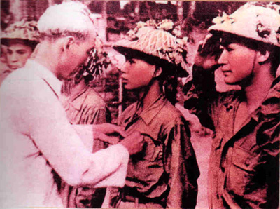 Bác Hồ gắn Huy hiệu của Người cho các chiến sĩ lập công xuất sắc sau Chiến dịch Điện Biên Phủ. Ảnh do CCB Hoàng Đăng Vinh cung cấp