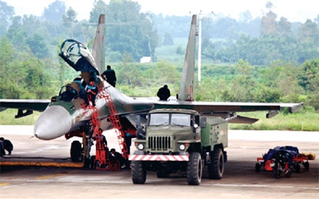 | Các thành phần bảo đảm của Đoàn Không quân Lam Sơn làm công tác chuẩn bị máy bay SU-30MK2 trước ban bay. |