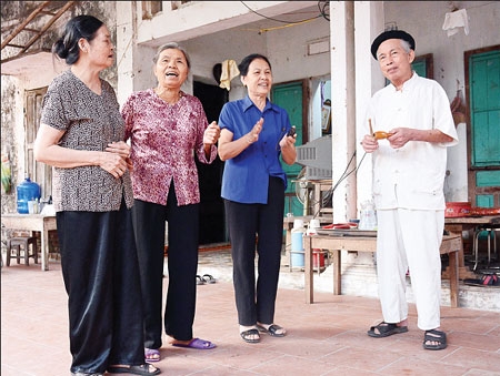Các nghệ nhân hát giới thiệu một làn điệu trống quân Dạ Trạch.
