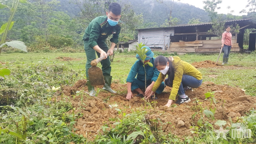 Cán bộ Đồn Biên phòng Sơn Hồng (Ban chỉ huy Bộ đội Biên phòng tỉnh Hà Tĩnh) giúp dân trồng cây ăn quả. Ảnh: DUY PHAN