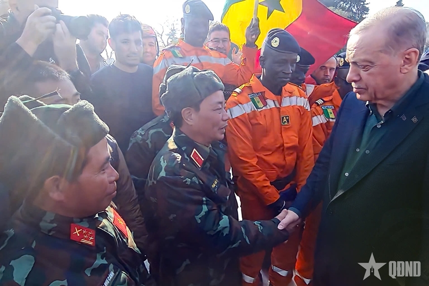 Đến thăm các đội cứu hộ quốc tế, bắt tay Thiếu tướng Phạm Văn Tỵ, Tổng thống Thổ Nhĩ Kỳ Tayyip Erdogan cảm ơn sự hỗ trợ kịp thời của Việt Nam (tháng 2-2023). Ảnh do Cục Cứu hộ-cứu nạn cung cấp