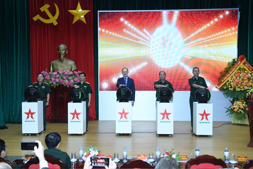 Đại sứ Nga tại Việt Nam Gennady Stepanovich Bezdetko (giữa) và Thiếu tướng Đoàn Xuân Bộ, Bí thư Đảng ủy, Tổng biên tập Báo QĐND cùng các đại biểu nhấn nút khai trương Báo QĐND Điện tử tiếng Nga. Ảnh: PHÚ SƠN