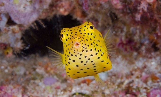 Về màu sắc, cá nóc hòm vàng thực sự là “ngôi sao” của đại dương. Cơ thể chúng thường có màu vàng tươi hoặc vàng cam, điểm xuyết những đốm đen nổi bật, tạo nên sự tương phản rõ nét. Màu sắc rực rỡ ấy không chỉ mang giá trị thẩm mỹ mà còn đóng vai trò như một tín hiệu cảnh báo sinh học cho thấy đây không phải là con mồi dễ bị tấn công. Thực tế cho thấy, khi bị đe dọa, cá nóc hòm vàng có khả năng tiết ra độc tố khiến nhiều loài săn mồi phải dè chừng và tránh xa.