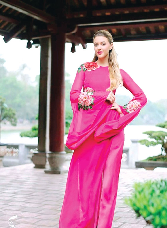 Madison Anderson mặc áo dài tại đền Ngọc Sơn, hồ Hoàn Kiếm (Hà Nội). Ảnh: fanpage của cuộc thi Hoa hậu Hòa bình Quốc tế 2017 |