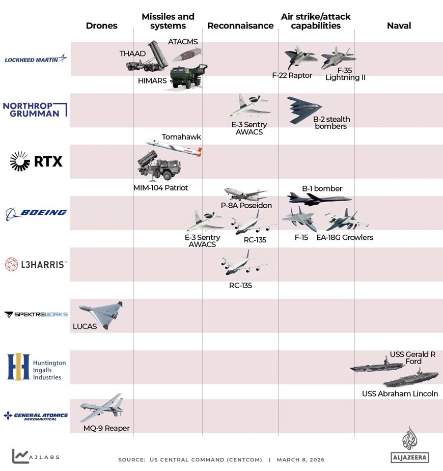 | Các loại vũ khí Mỹ triển khai tấn công Iran trong chiến dịch Epic Fury (Cơn cuồng nộ) và thông tin các công ty sản xuất vũ khí. Ảnh: Al Jazeera |
