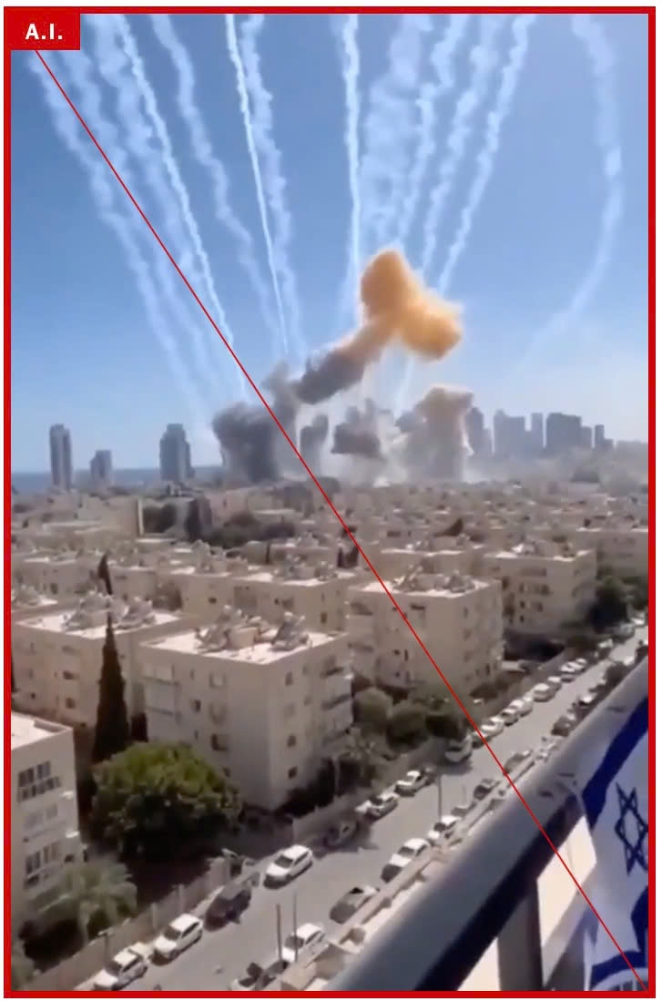 | Ảnh chụp màn hình một video clip giả mô tả cảnh tên lửa Iran bắn trúng các căn cứ chiến lược của Israel. Ảnh: The New York Times |