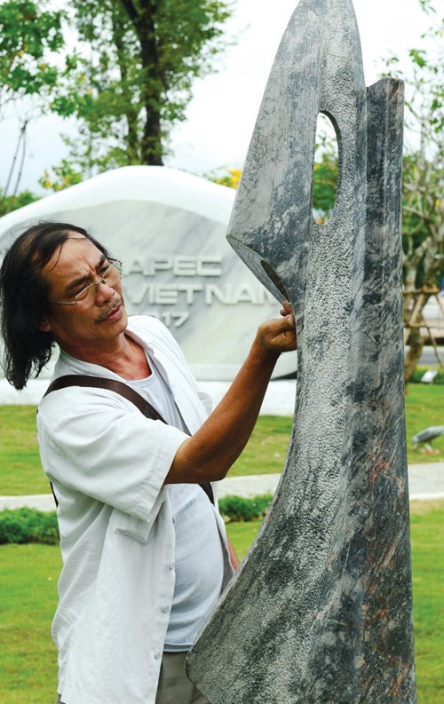 Nhà điêu khắc Nguyễn Long Bửu bên tác phẩm “Bố cục” trưng bày tại Công viên APEC 2017.