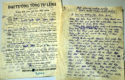 | Bản thảo bài báo viết trong chiến dịch Điện Biên Phủ của Đại tá Phạm Phú Bằng. Ảnh chụp lại |