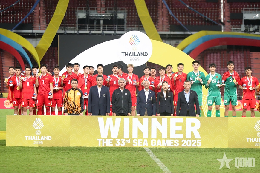 Các cầu thủ U.22 Việt Nam rạng rỡ nhận huy chương vàng SEA Games 33.
