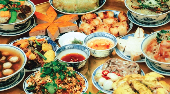 Mâm cỗ Tết thể hiện triết lý ngũ hành âm dương. Ảnh: NGỌC KHANG |