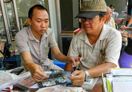 Khách “đi chợ” trao đổi tem ở chợ tem Hà thành.