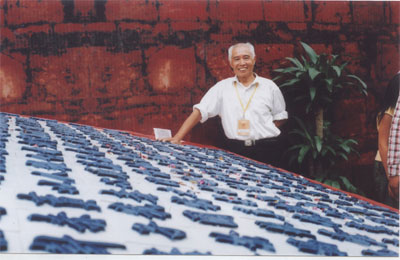| Ông Hoà bên tác phẩm "Bình Ngô đại cáo" ghép bằng gốm sứ |