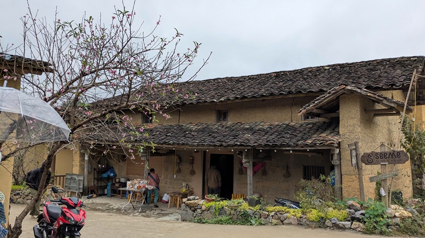 | Hoa đào đã bừng sáng bên mái nhà cổ. |