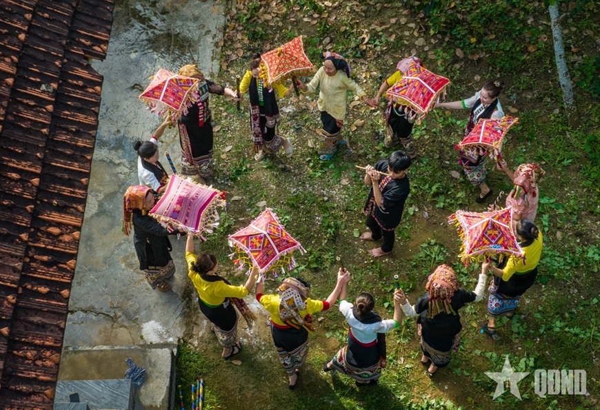 Ở cao trào, một cô gái trẻ thường là người có giọng hát hay, dáng múa đẹp sẽ được chọn hóa thân thành “nàng Tiên Trăng”. Cô xuất hiện giữa vòng người, khoác lên mình trang phục truyền thống rực rỡ. Trong tiếng reo vui, nàng tiên biểu trưng cho điều tốt đẹp đã được “mời” về với bản. Đi kèm trò diễn là những điệu múa xòe uyển chuyển. Vòng xòe mở rộng dần, tay nắm tay, bước chân nhịp nhàng theo tiếng khèn, tiếng trống. Vòng tròn ấy như hình ảnh của mặt trăng với sự tròn đầy, gắn kết và không có khoảng cách.