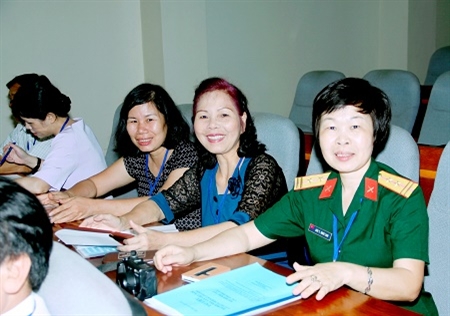 | Trung tá Bùi Thị Như Lan (ngoài cùng bên phải) và các đồng nghiệp nữ tại Đại hội Hội Nhà văn Việt Nam lần thứ IX, tháng 7-2015.(Ảnh: GIA BẢY) |